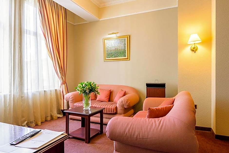 This suite has a separate bedroom with a large double and a single bed, and a living room with sofas and a work desk. Facilities include mini bar, direct dial telephone, WiFi, and a TV with satellite channels. The bathroom comes with a shower, toiletries, towels, a hairdryer and a panic button.